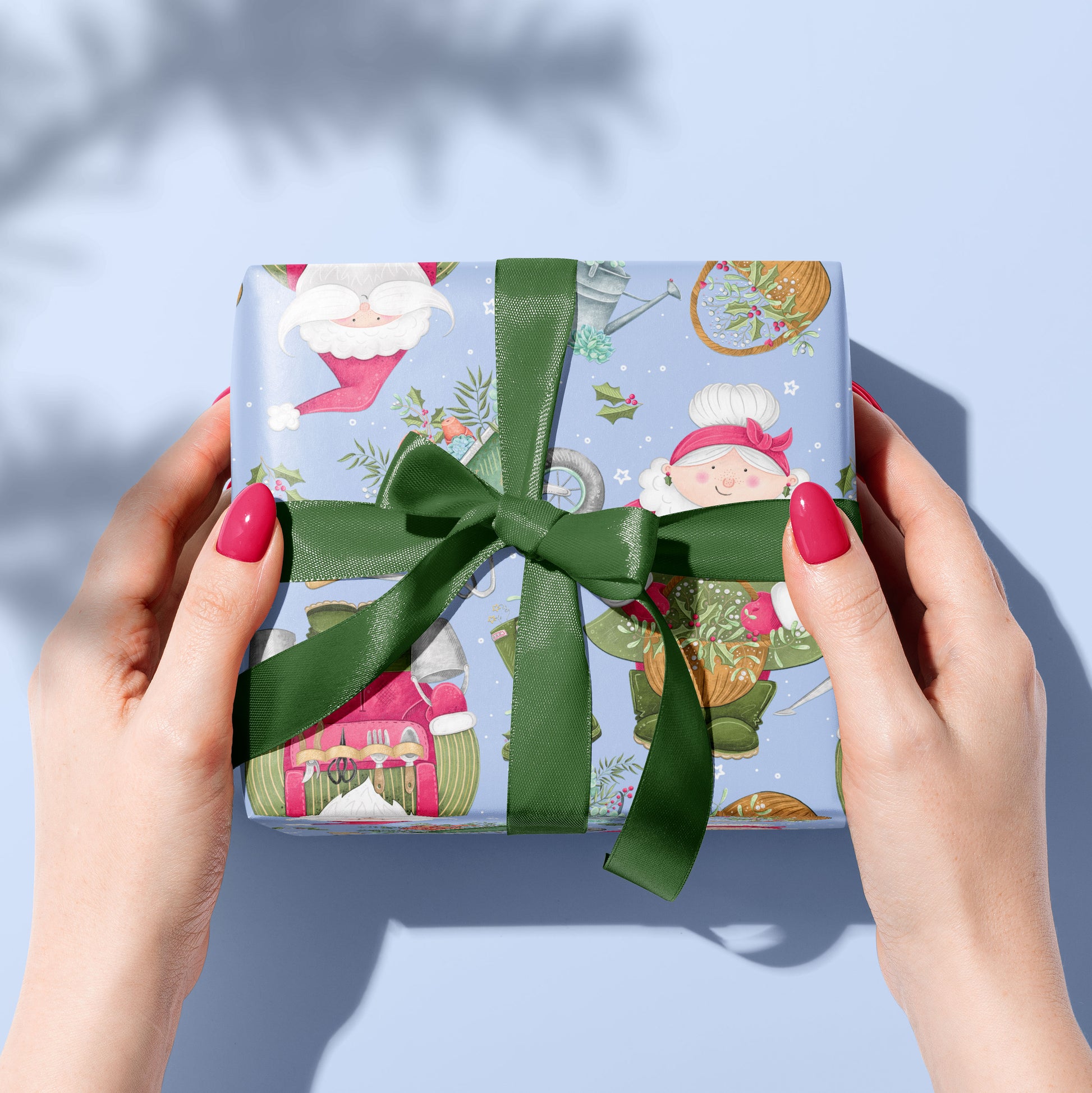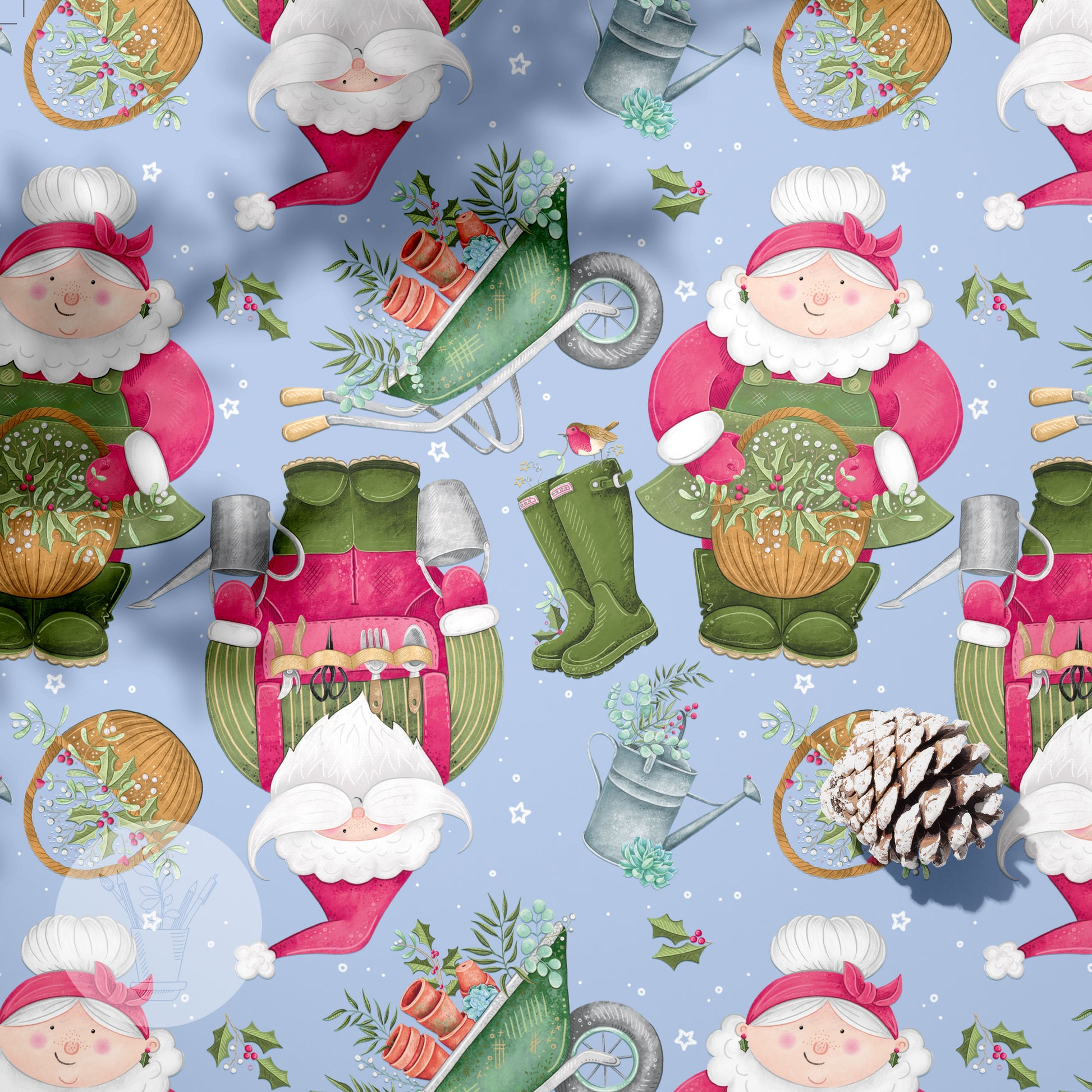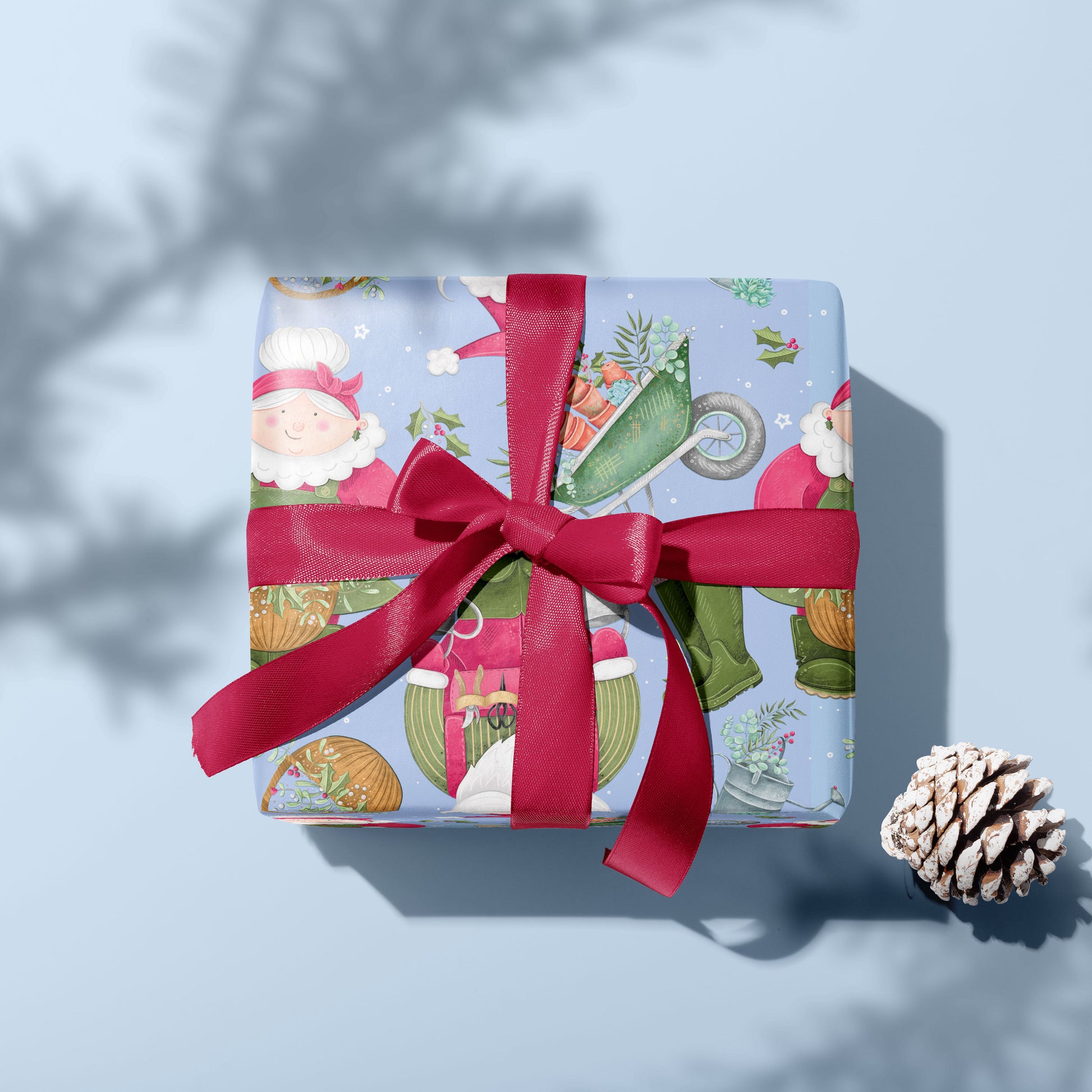 A fun, gardening inspired novelty gift wrap. Featuring Mr & Mrs Claus with garden related accessories, this is a must-have for wrapping presents suited towards green-fingered friends and loved-ones, or simply as a unique gift wrap for Christmas.