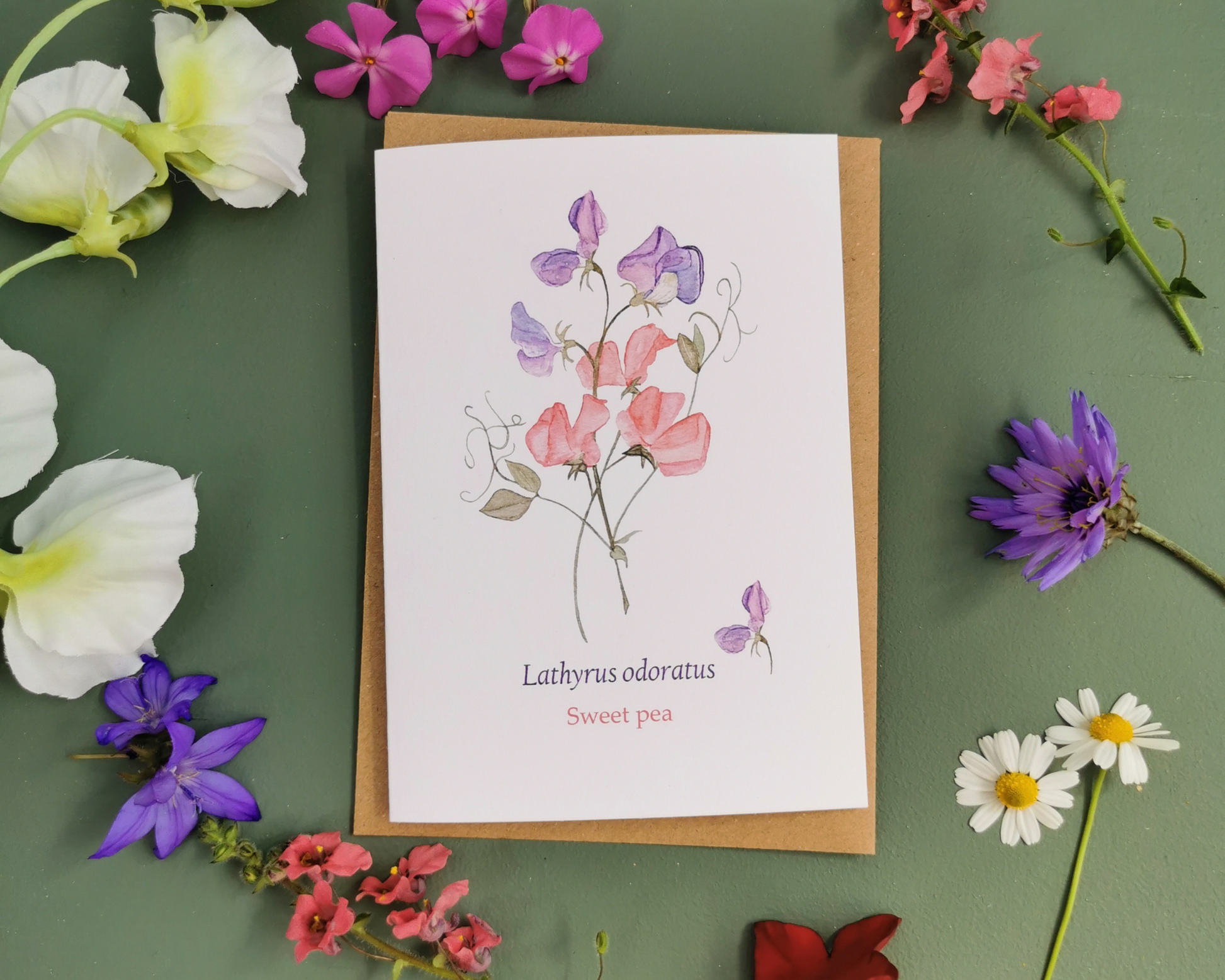This card features an illustration of one of nature's most loved summer flowering plants; the sweet pea!