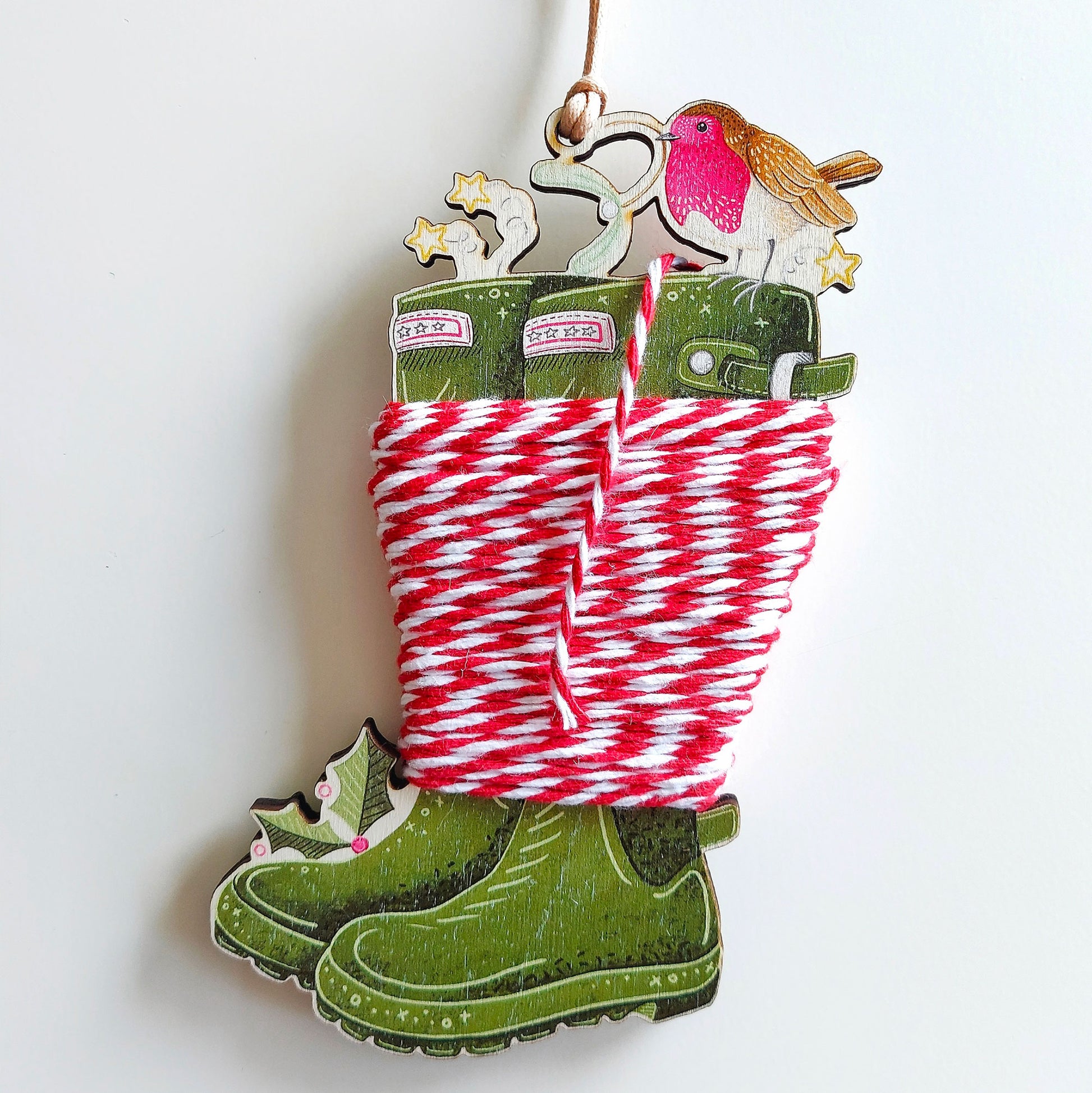 Spruce up your Christmas tree with this quirky wooden wellington boot ornament, complete with twine for wrapping your presents.